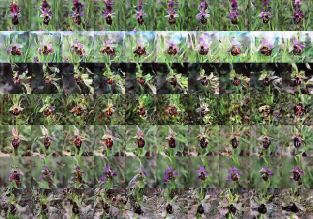 Auf die Klassifizierung von Bildern mittels Neuronaler Netze folgt als nächster Schritt die Erzeugung künstlicher Bilder. Unter Verwendung von Generative Adverserial Networks (GANs) begannen wir, die Maschine Orchideen zeichnen zu lassen. Schritt für Schritt nähert sich das Netz etwas an, das als Bild einer Orchidee gelten könnte. 64 Pixel im Quadrat klein sind die Bilder und zigtausende davon ließen wir zeichnen. Die Serien zeigen das langsame Entstehen eines immer konkreter werdenden Bildes einer Pflanze. Welches Verständnis die Maschine von der Orchidee hat, bleibt offen.